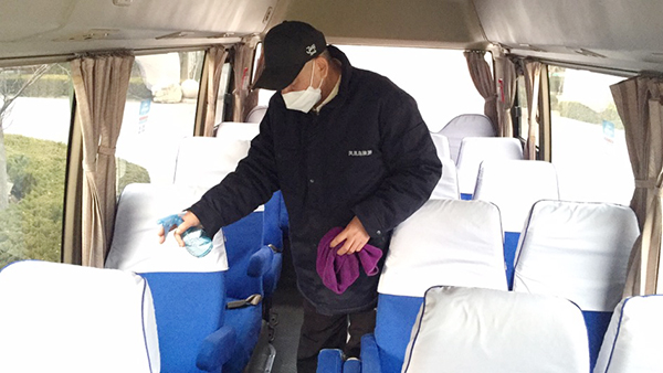 公司為在崗員工發(fā)放了口罩、噴壺、消毒酒精等防護用品,每日對各工作場所、班車、車庫、電梯、宿舍等進行定點消毒。